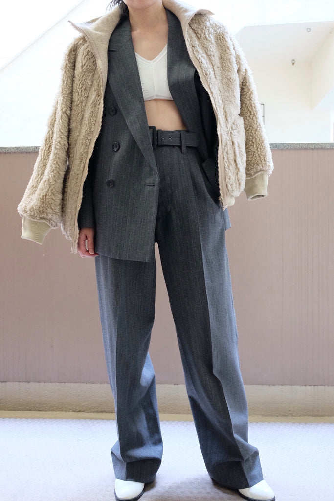レーヨンをブレンドすることで程よい落ち感と柔らかなドレープでのボリュームを共素材のベルトで絞って着用。