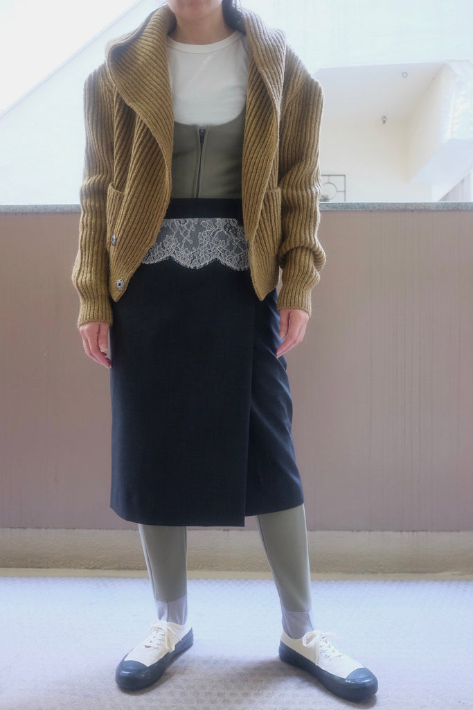 スーツ生地で大人な印象もありつつ、寂しくなりがちな冬のスタイリングにレースがアクセントになるおすすめの一着です。