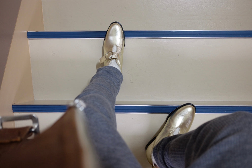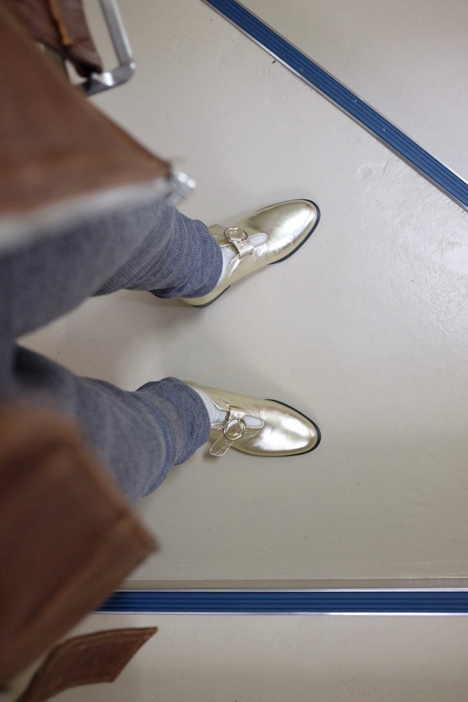 ヒール約2.5cm、甲の高い位置でのストラップ付きで安定感抜群のシューズです。