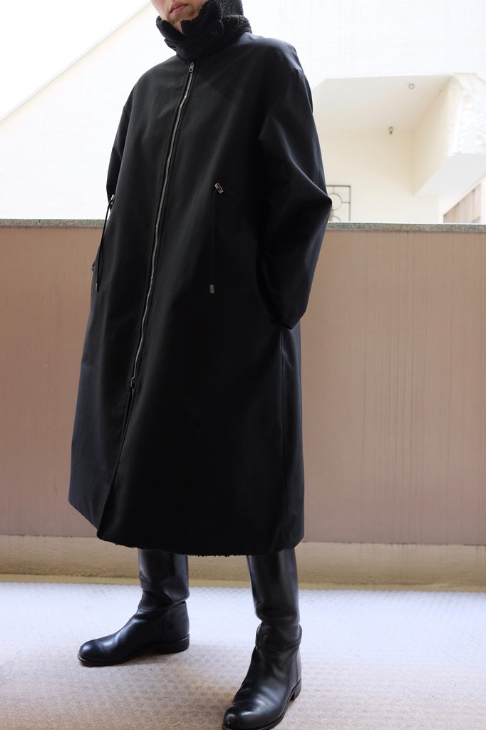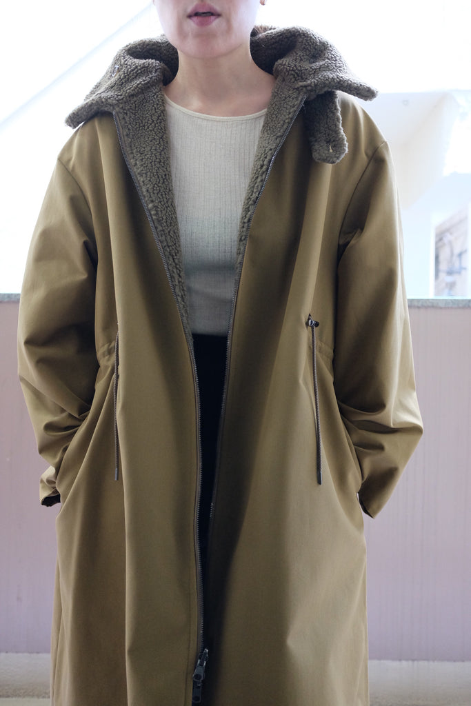 表で着用するとボアメインのコートになり、裏で着用するとシェルタフタのコートになります。