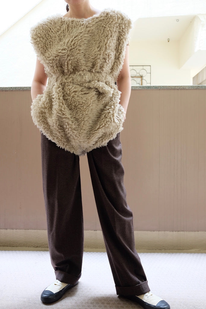 無染色ウール、生成リネンをブレンドした原料をパイルに使用したナチュラルで深みのある色合いで保湿性の高いボア素材を使用したコスチュームロンパース。