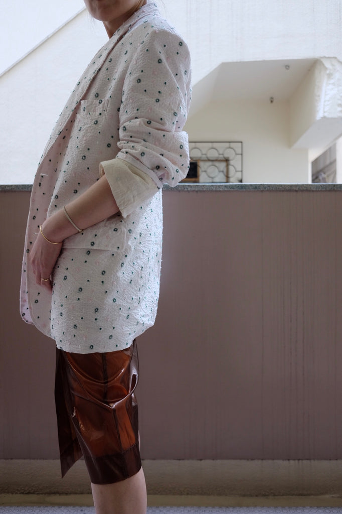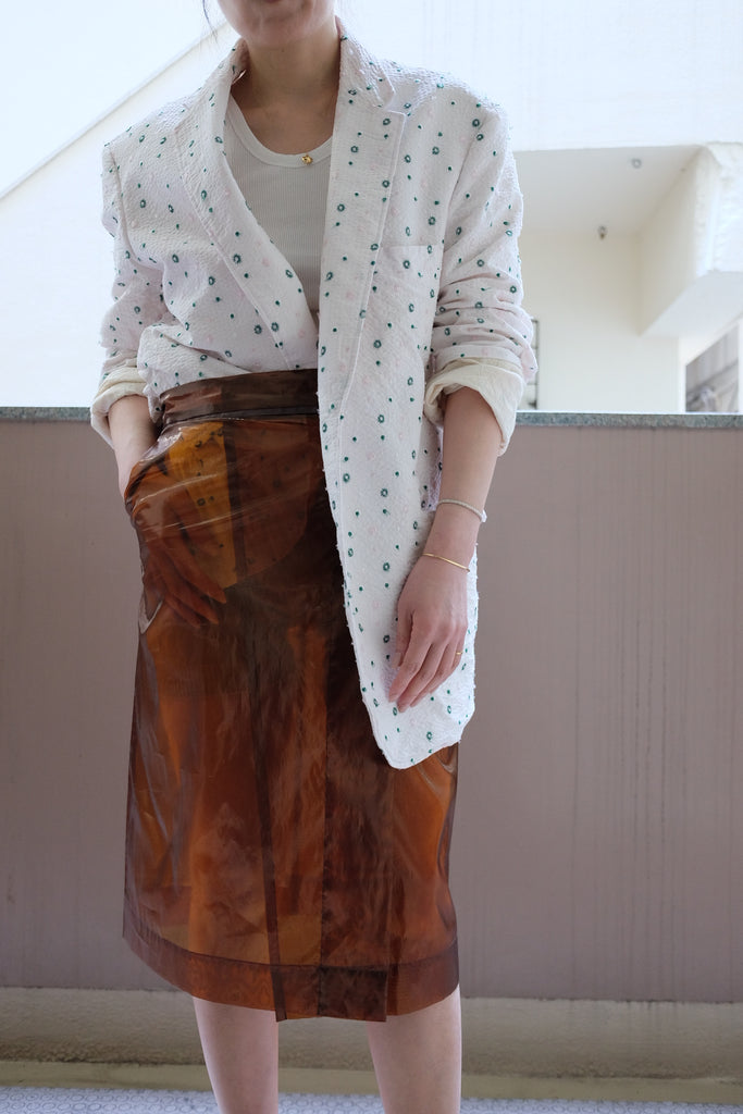 琥珀のような深みのある透明感が印象的なポリエステルフィルム素材のミディスカート。