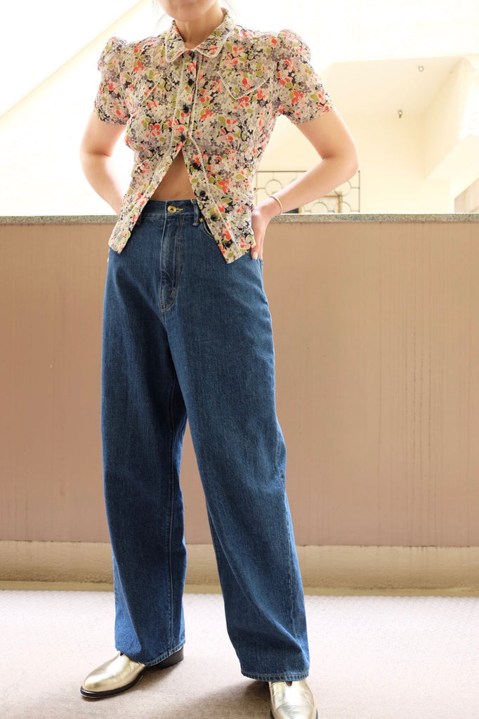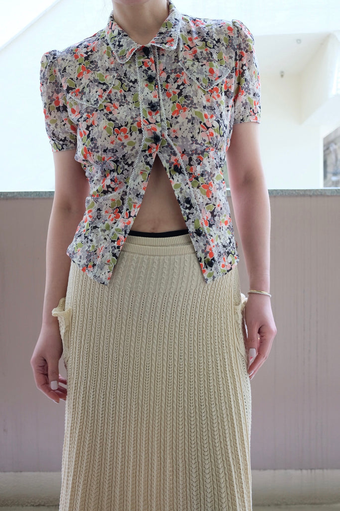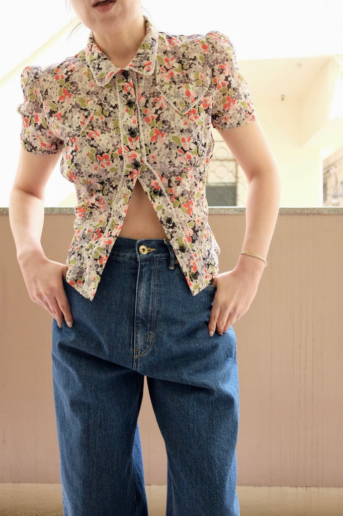 フィードサックのような表情を持つボイル素材に、ハンドスクリーンで施したフラワープリントをのせた半袖シャツ。