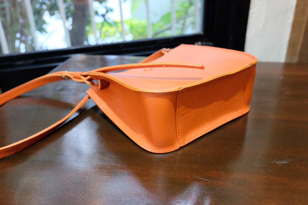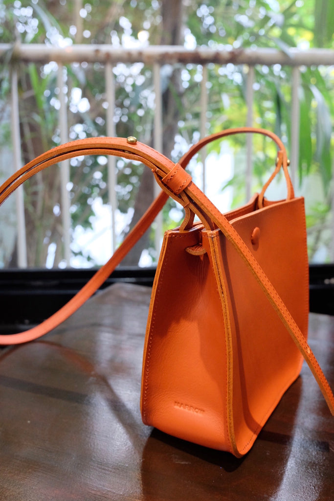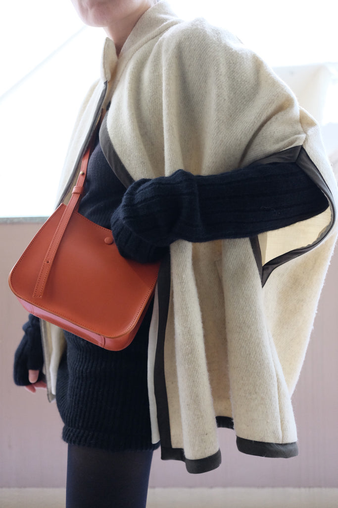 一見シンプルでラフな作りのように見えるが、裏地を付けつつ外縫いで作られたハンドバッグの仕立てになっており、形がしっかりと出るように底マチも重ねて作られている。