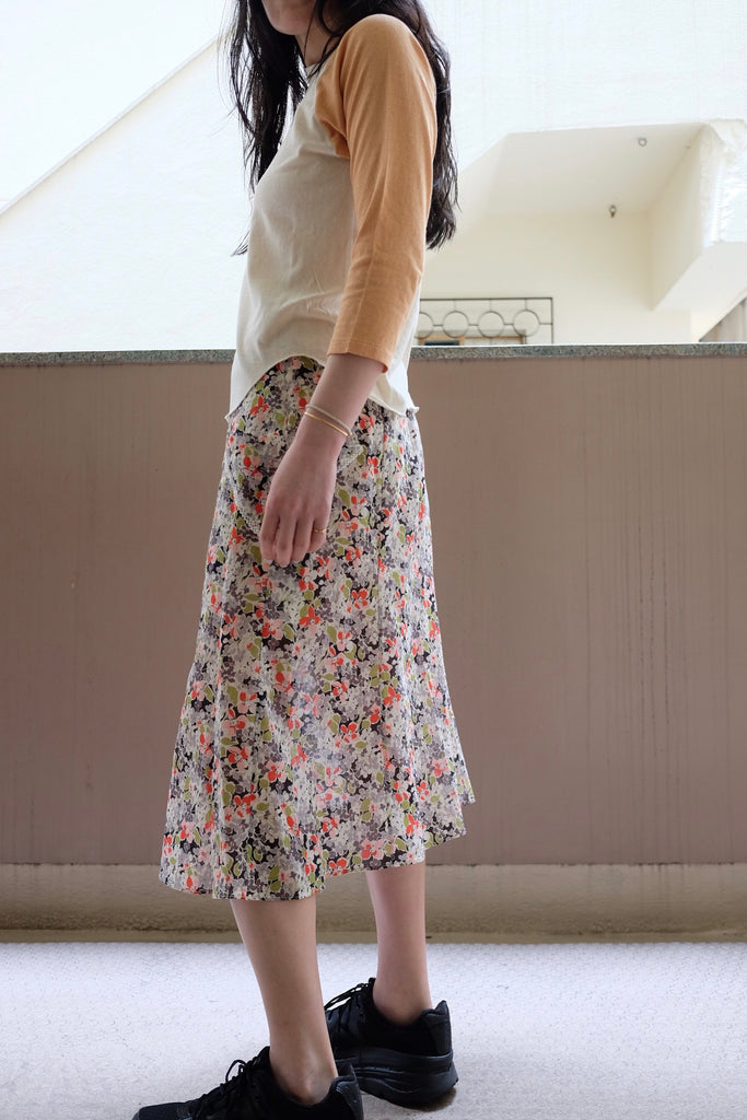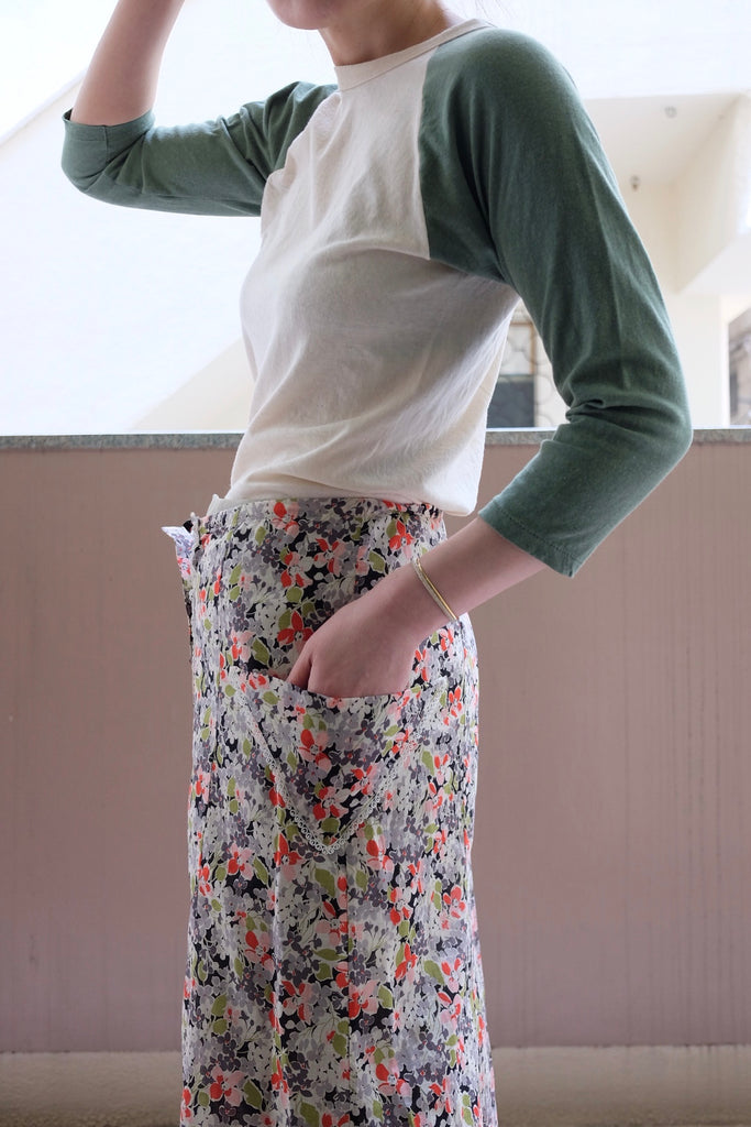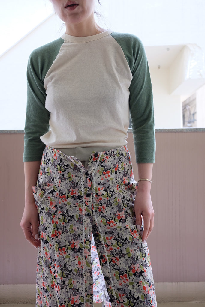 ムラ感のあるコットン糸を丸胴で編み立てたコットンジャージーを使用した七部袖Tシャツ。